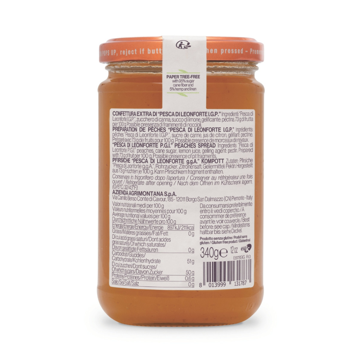 "Pesca di Leonforte I.G.P.", zucchero di canna, succo di limone, gelificante: pectina. 73 g di frutta per 100 g. Possibile presenza di frammenti di noccioli.