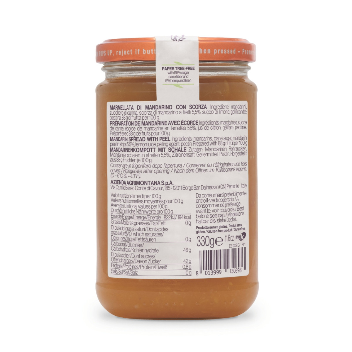 Mandarini, zucchero di canna, scorza di mandarino a filetti 5,5%, succo di limone, gelificante: pectina. 88 g di frutta per 100 g.