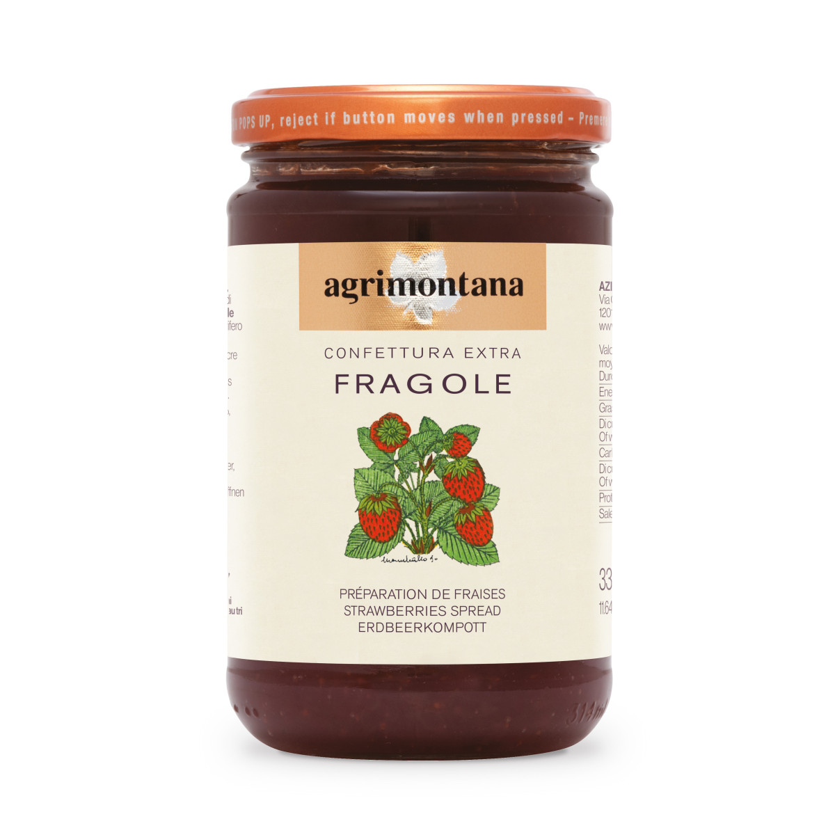 Fragole 72%, zucchero di canna, succo di limone, gelificante: pectina.