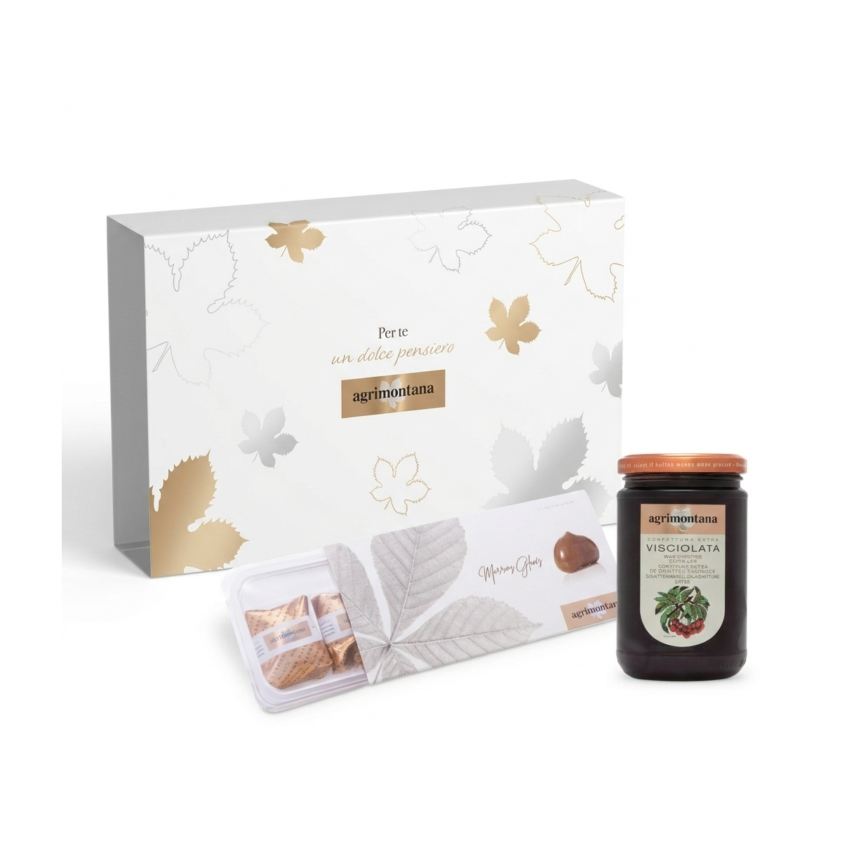 Confezione regalo esclusiva con un vasetto di visciolata e una confezione di marrons glacés stagnolati.