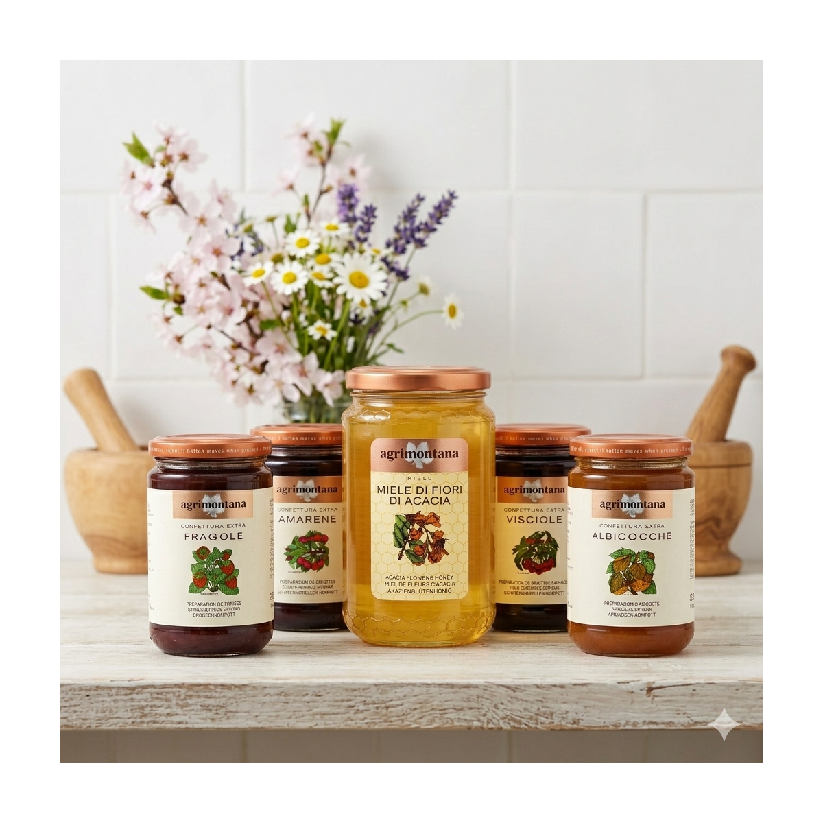 La Dispensa Primaverile è un bundle pensato per rifornire la dispensa con i sapori freschi della primavera agrimontana. Una selezione di confetture extra di frutta di stagione (albicocche, visciole, amarene, fragole) e miele di fiori di acacia (formato grande 400g). Si tratta di un bundle di prodotti senza confezione regalo dedicata: riceverai i singoli articoli così come li trovi normalmente a catalogo, da utilizzare subito o da organizzare come preferisci nella tua dispensa.