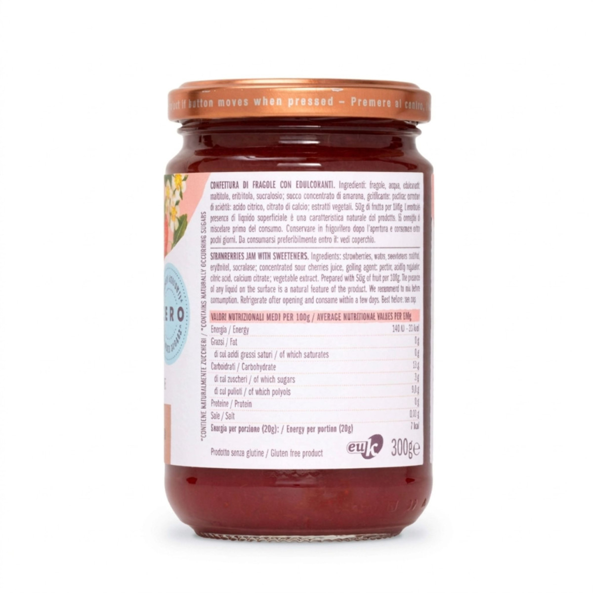 Fragole, acqua, edulcoranti: maltitolo, eritritolo, sucralosio; succo concentrato di amarena, gelificante: pectina; correttori di acidità: acido citrico, citrato di calcio; estratti vegetali. 50g di frutta per 100g. Zero zuccheri aggiunti - contiene naturalmente zuccheri.