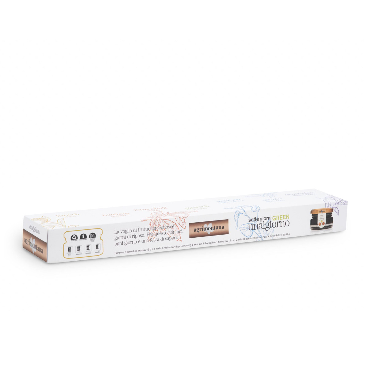 Astuccio 5 confetture + 1 marmellata + 1 miele. Le confetture UNALGIORNO Green rispecchiano la filosofia agrimontana. Per il packaging viene usata carta riciclabile ecosostenibile, che non contiene cellulosa.