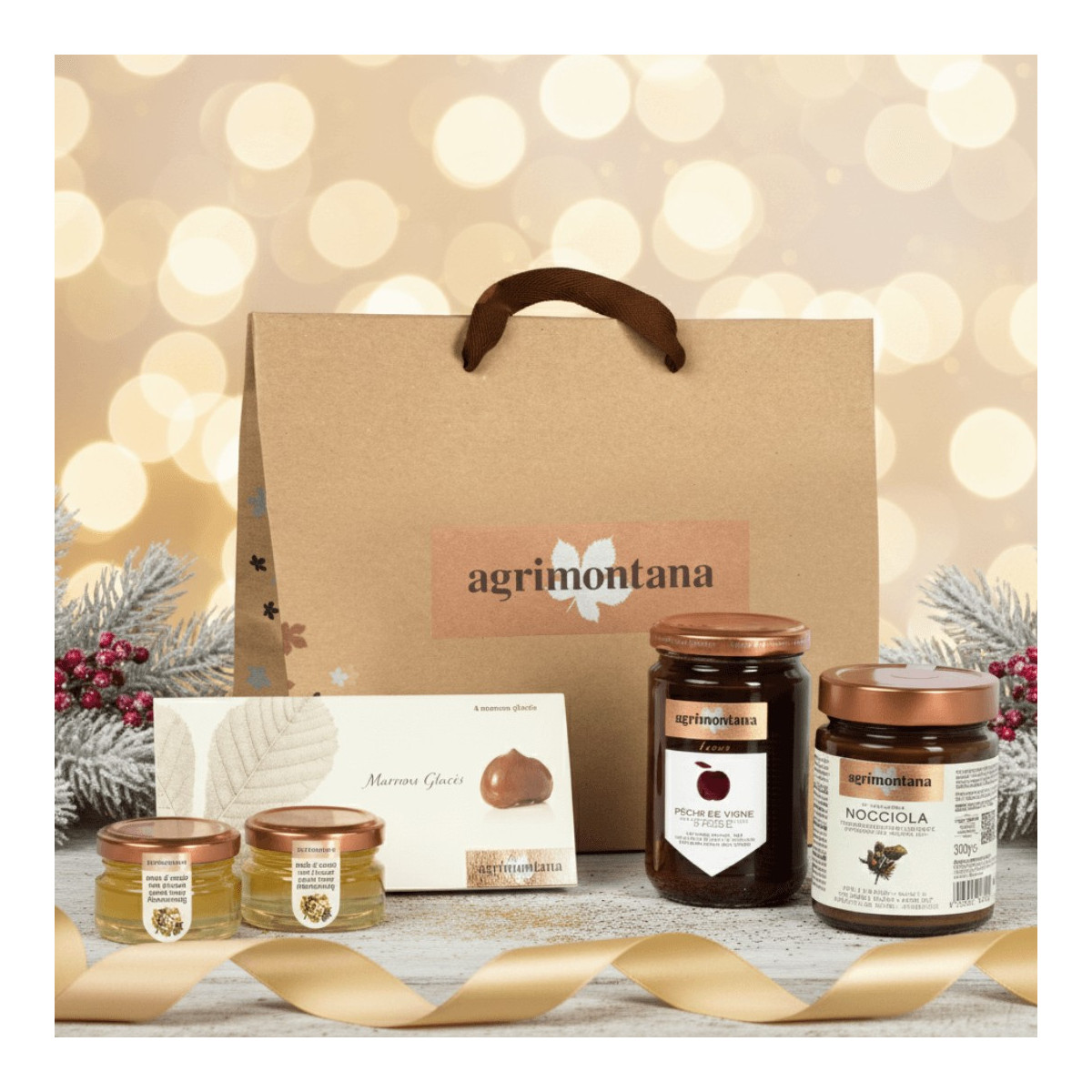 Il perfetto equilibrio tra formato compatto e grande qualità. Marrons glacés artigianali, confettura di pesche senza conservanti, doppio miele di acacia e crema di nocciole piemontesi si uniscono in una confezione elegante che racchiude cinquant'anni di tradizione Agrimontana. Un regalo aziendale che sa conquistare con autenticità e raffinatezza.
